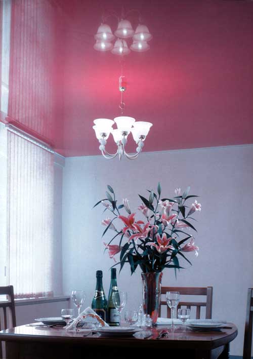 Потолок из виниловой пленки не боится ударов и не трескается, легко моется. И, кроме того, соответствуют самым строгим международным требованиям экологии и пожаробезопасности.