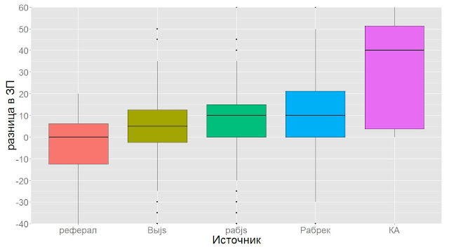 И самое прикольное: посмотрите на картинку. Это разница в зарплате на предыдущем и новом местах работы в зависимости от того, как кандидат нашел работу. Т.е. у нас у всех цель найти работу с более высокой зарплатой, верно? И я исследую, что влияет на то, что зарплата на новом месте получается выше. Здесь несколько инсайтов: