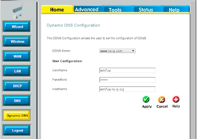 C no-ip.com закончили. Перейдем к настройке D-Link DSL-G604T Заходим на D-Link, переходим на закладку Home->Dynamic DNS Выбираем сервис, на котором регистрировались(см. выше), вводим имя пользователя, пароль(данные для авторизации на сайте http://no-ip.com) и имя хоста, который добавили. Сохраняем настройки и перегружаем устройство. На этом все.