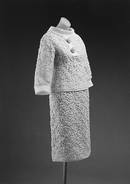 Вечерний ансамбль из коллекции весны-лета 1963 г. (музей Метрополитан, Нью-Йорк). Новый лаконичный неприталенный силуэт прекрасно, как оказалось, сочетается с изысканной сложной фактурой. Такой костюм можно было бы сделать из твида, шерсти, плотного шёлка и носить днём, а в кружевном варианте он прекрасно подходил для театра или ужина.