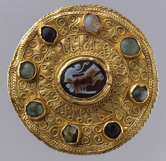 Золотая брошь со вставками из цветного стекла, которая хранится в музее Метрополитан, была сделана лангобардами, в VI в. Однако камея, украшающая середину – римская, начала первого тысячелетия.