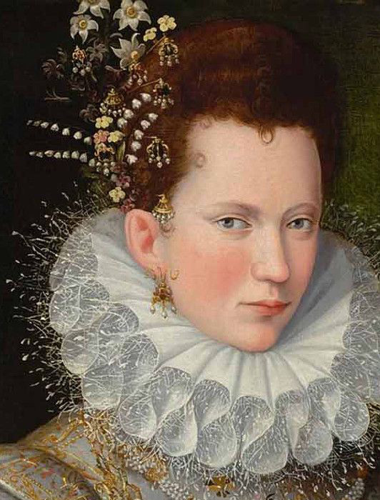 Портрет неизвестной прекрасной дамы кисти художницы Лавинии Фонтана, 1590-е. На ней платье по испанской моде конца XVI века, с ниспадающими рукавами-крыльями и огромным плоёным воротником.
