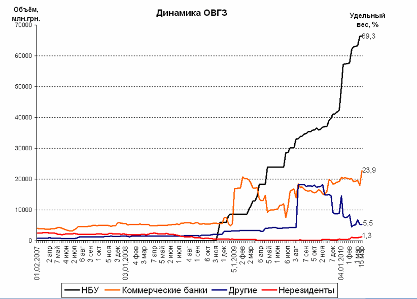 проедание" и не принесли положительного эффекта в экономике страны. C начала 2009 года на рынке облигаций внутреннего займа активно работали коммерческие банки, а с весны этого же года основным кредитором вновь становится НацБанк.