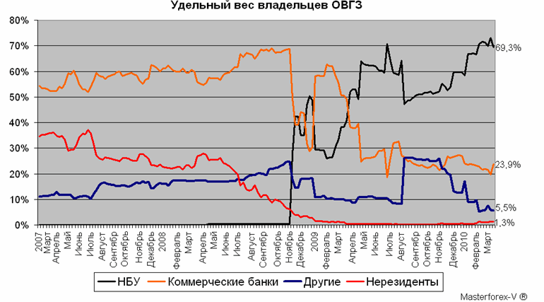 Рост объемов долговых ОВГЗ в портфелях коммерческих банков и НБУ, незначительная доля владения долговыми обязательствами населением и нерезидентами ведут к увеличению негативного давления на