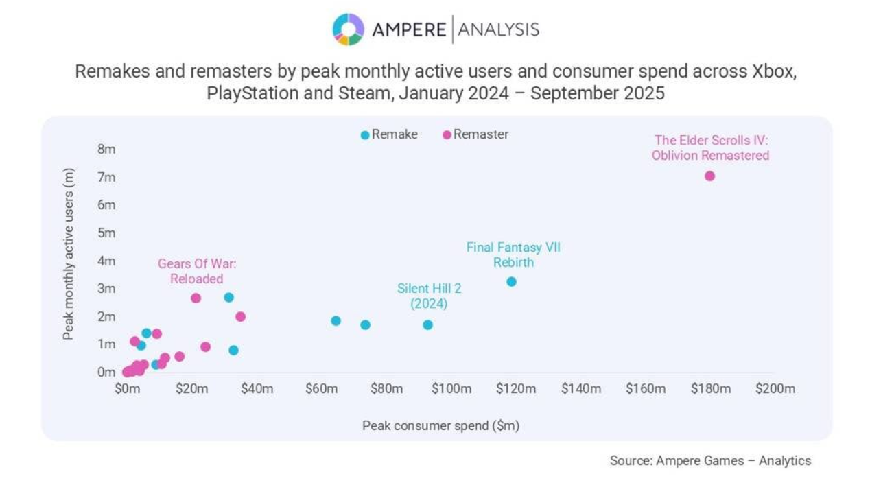 Ampere изучила 42 релиза — 15 ремейков и 27 ремастеров — и выяснила, что средние траты на ремейки оказались выше в 2,2 раза, чем на ремастеры.