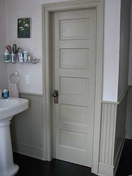Удачным вариантом будет дверь из массива дерева (хвойных пород), обработанного антисептическими растворами и покрытого лаком, облицованного пластиком или ламинатом. Можно поставить и шпонированную дверь, если для отделки были использованы качественные клеи и лаки (лак наносится в три слоя). Хорошим вариантом являются крашенные двери из МДФ и пластика. Пластик легок, прочен, устойчив к действию химических сред, за ним просто ухаживать. Последнее время стали популярны стеклянные двери, не меняющие