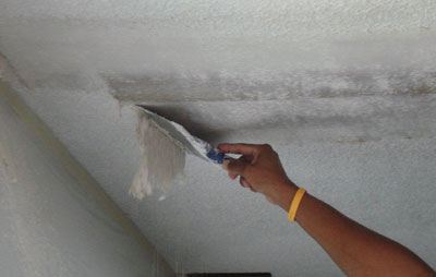 В зависимости от нанесенного ранее покрытия, смывается побелка, удаляются обои или плитка. С помощью шпателя или наждачной бумаги, ликвидируются отслоения и остатки клея. Старую краску можно удалить с помощью шпателя и разогрева поверхности строительным феном. При необходимости поверхность моется водой. Остальные работы следует проводить после полного высыхания потолка.