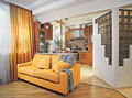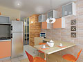 В отделке доминируют оттенки оранжевого и желтого, материалы разнообразны: дерево, металл, пластик, стекло, ламинированные ДСП.