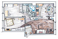 Планировка двухкомнатной квартиры площадью 94,1 м2 соответствует принципам фен-шуй: сглажены острые выступы стен, отсутствуют контрасты и резкие тени.