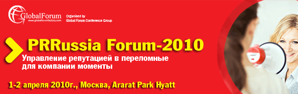 1-2 апреля 2010г., в г. Москвa, Ararat Park Hyatt Moscow состоится мероприятие всероссийского масштаба "PRRUSSIA FORUM-2010. Управление репутацией в переломные для компании моменты" - встреча PR-директоров, пресс-секретарей и других специалистов служб внешних коммуникаций компаний, работающих в сфере производства и услуг.