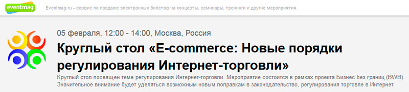 Международное Бизнес Сообщество Business Without Borders (Бизнес без границ), проводит круглый стол «E-commerce: Новые порядки регулирования Интернет-торговли». Мероприятие пройдет в форме встречи представителей власти с руководителями крупных интернет-проектов, а также предпринимателей, начинающие свой бизнес в сфере электронной коммерции.