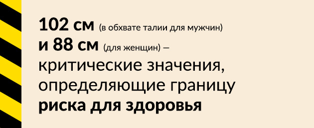 102 см в обхвате талии для мужчин и 88 см для женщин — критические значения, определяющие границу риска для здоровья.