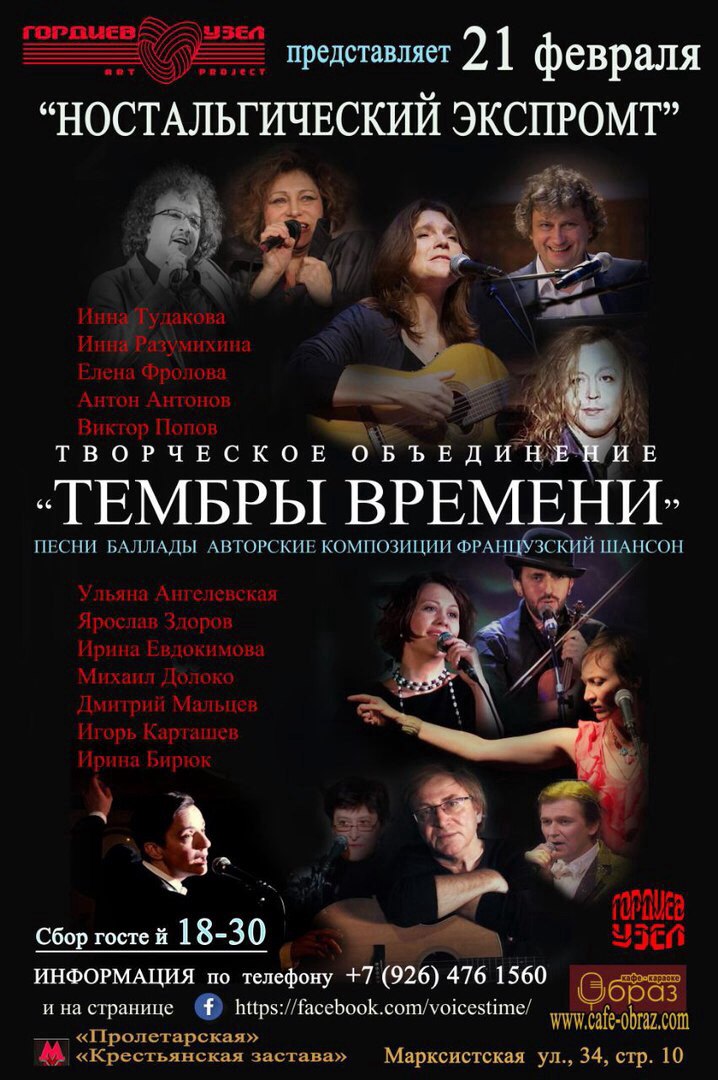 21 ФЕВРАЛЯ концерт проекта "ТЕМБРЫ ВРЕМЕНИ" Ульяна Ангелевская, Ирина Бирюк, Елена Фр. и другие артисты Театра Камбуровой. Начало в 19 час., метро "Пролетарская", ул. Марксистская, дом 4, корп. 10, Арт-кафе "Образ".