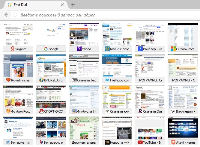Это очень удобный способ для доступа к сайтам. Все закладки имеют миниатюру изображения сайта, загруженную автоматически, или вручную. Пользователь сразу может открыть нужный сайт, ориентируясь по его картинке, или подписи. Окна с изображениями сайтов можно перемещать в нужное место в стартовом окне. В окна вместо изображений можно добавить папки.