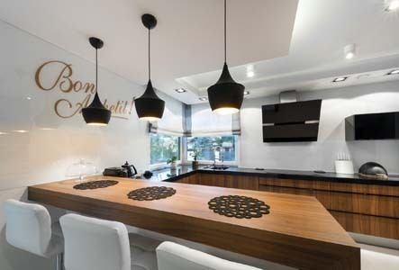 Люстра в интерьере кухни выполняет не только функцию осветительного прибора, но и является частью общей композиции и элементом дизайна
