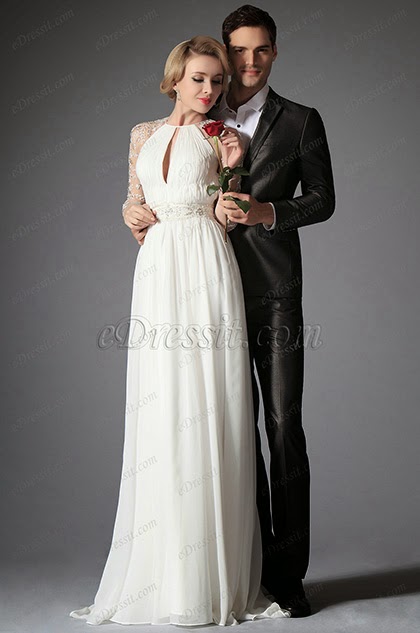 Завышенная талия начинается от груди. Она практически всегда украшается бижутерией, кружевами или вышивкой. Прямая юбка от талии до пола лежит свободно и легко. Лёгкие шелковистые материалы подчеркнут таинственную сексуальность невесты.