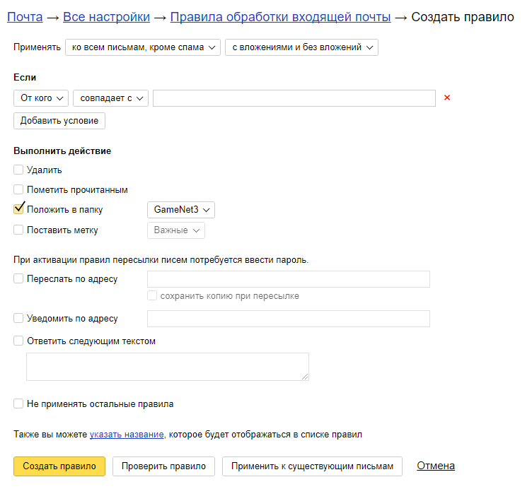 В открывшемся окне вы можете создать более сложные условия и действия в зависимости от данных условий над поступающими на почту письмами.