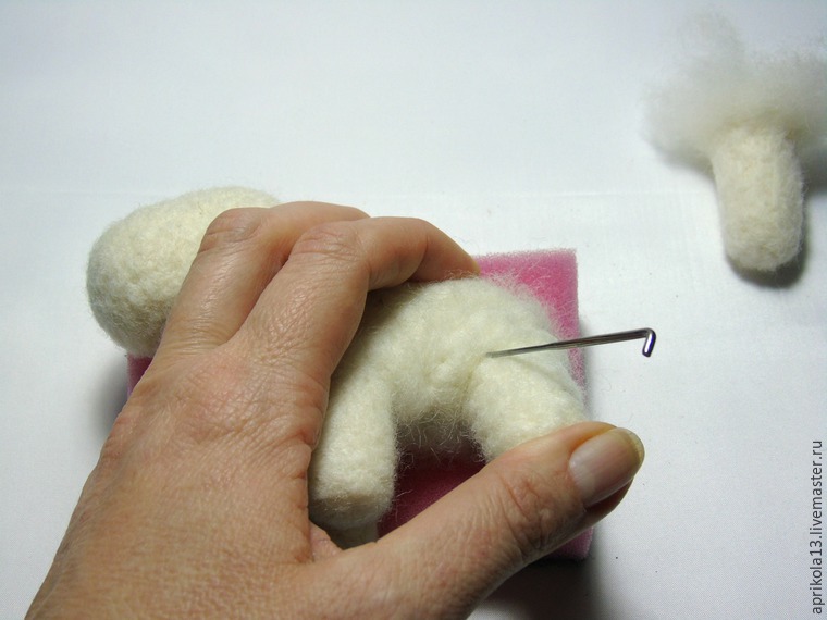 2. Берём белой шерсти примерно 6-7 г, и начинаем валять голову иглой № 36 в виде овала.