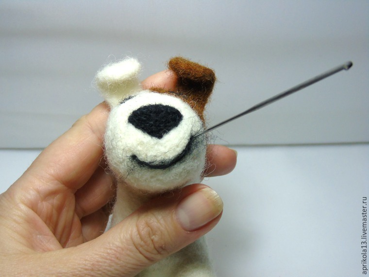 Иголочкой №38 не глубоко, по поверхности, прорабатываем миллиметр за миллиметром всего пёсика, сглаживая все неровности на поверхности. Если где-то есть складочки, берём маленький (прозрачный) клочок шерсти, и маскируем эти складочки.