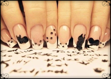 Отпечатки лапок и кошки придают этому французскому маникюру ещё лучший вид!Кошачьи французские кончики с мяу-эффектом для Хеллоуина
